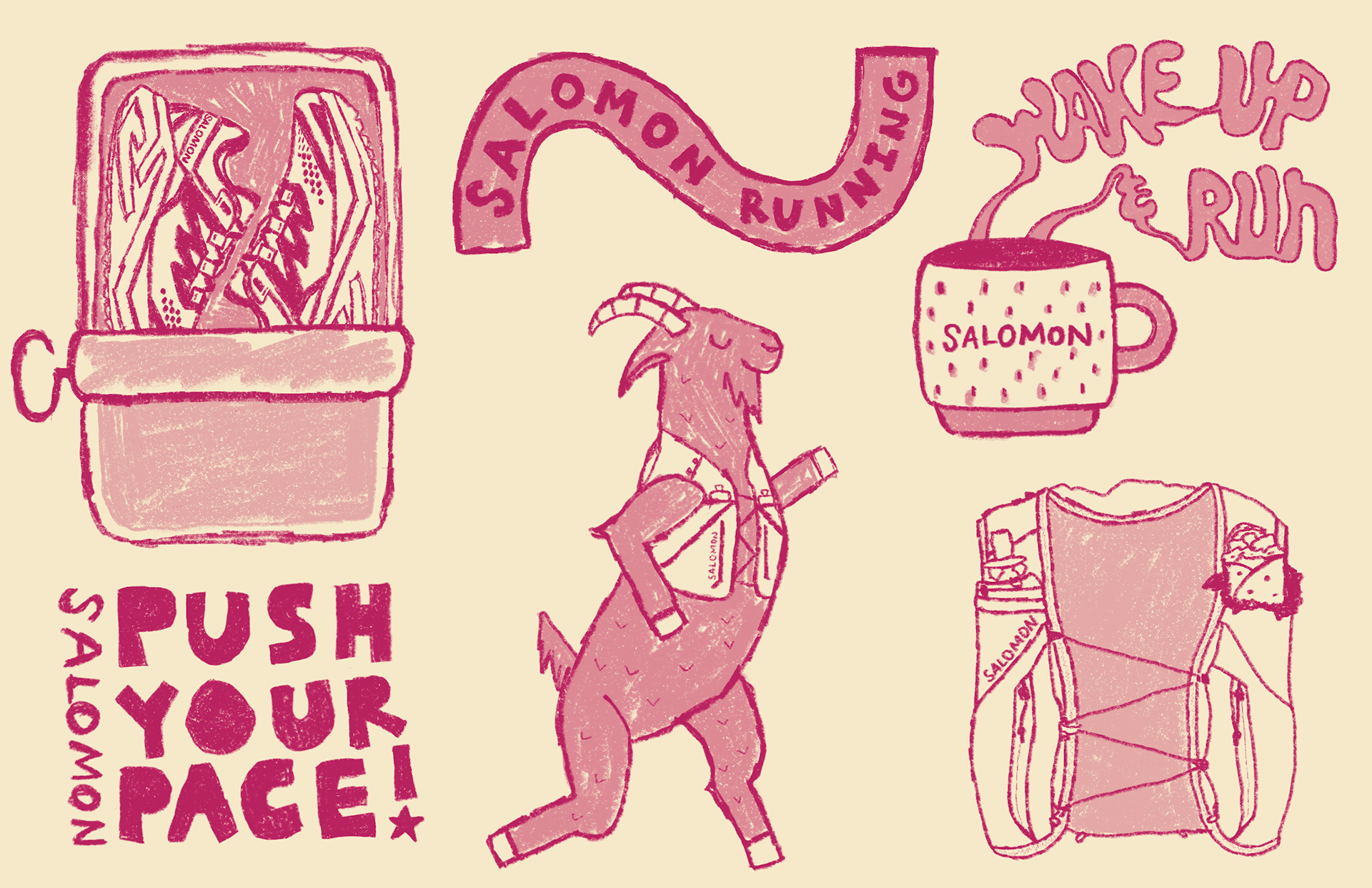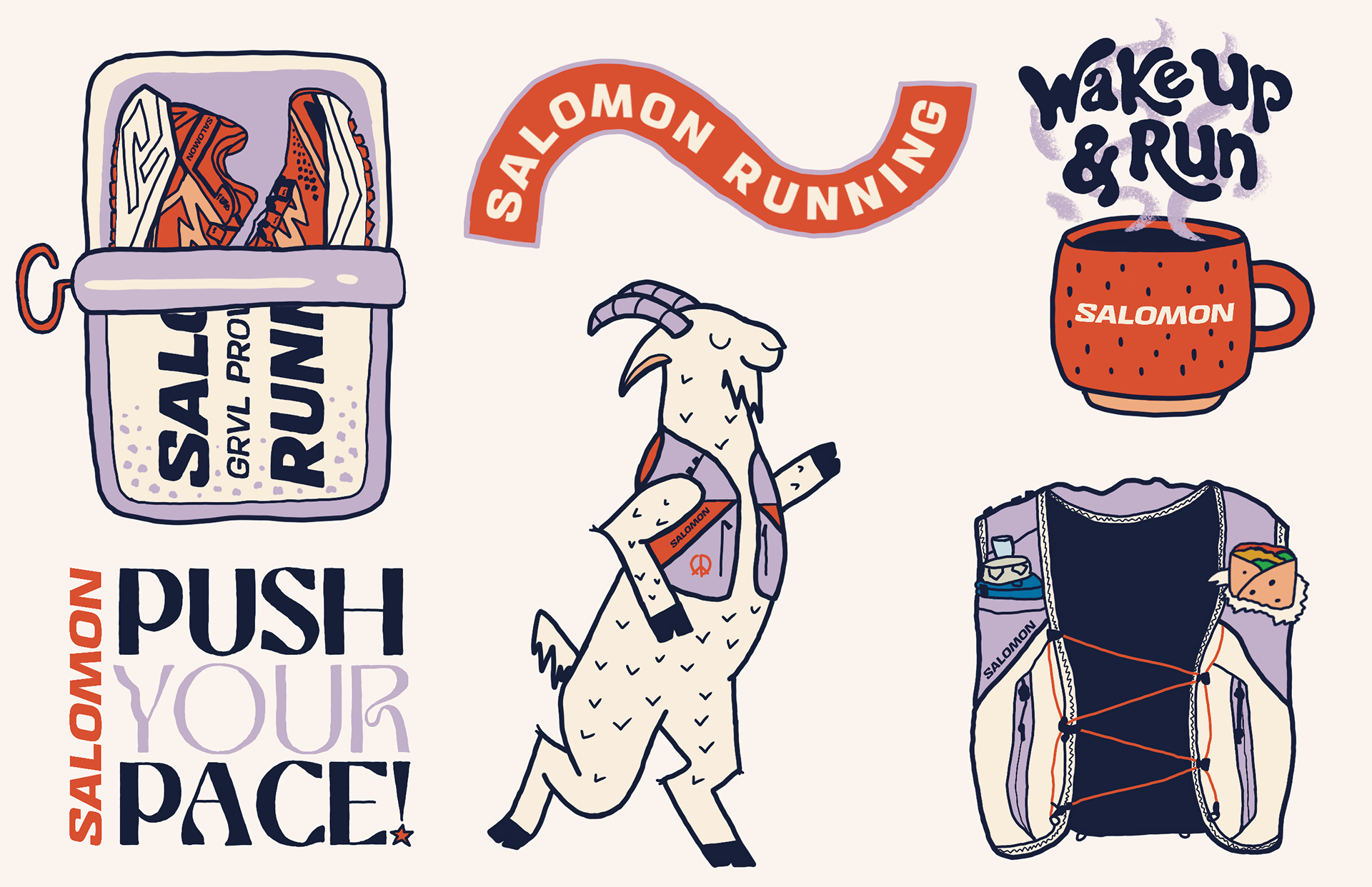 6 illustrations that each stand on their own as stickers but work together in a set. Salomon's new gravel shoes are featured in a sardine can, a Salomon Running banner to represent the brand category, The Goat representing Courtney Dauwaulter, a Salomon athlete, and two phrases for runners to feel motivated and proud of their sport.