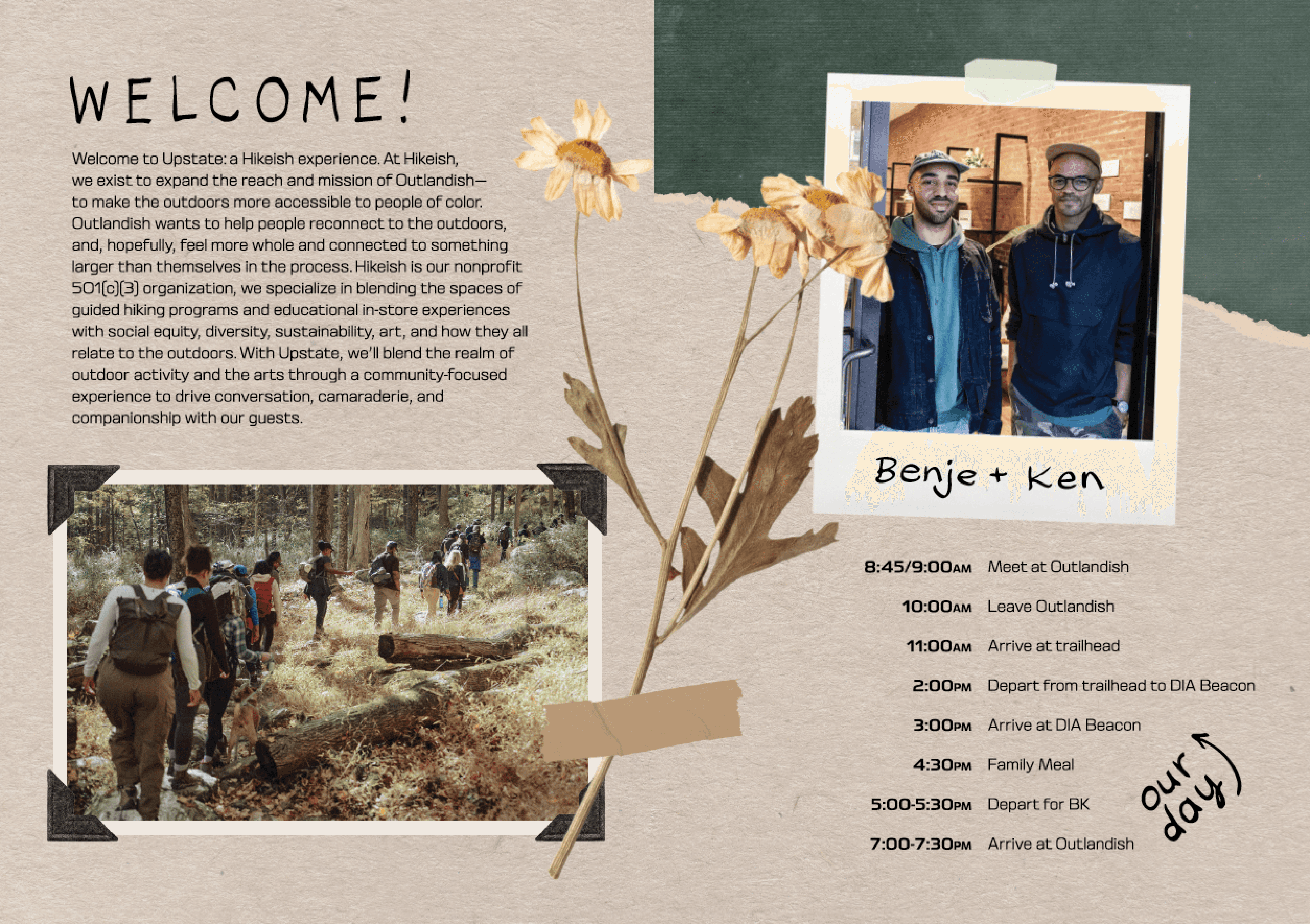 Inspired by vintage postcards and handwritten notes, we aimed to create materials that felt personal and welcoming. We used photos from upstate New York and iconography from the hike to tie everything together. The work included a poster, a printed invitation, social media posts, a sticker, and a small activity booklet designed for people to fill up the time on the train ride to the hike.